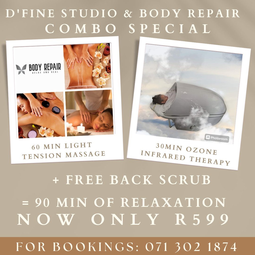 60min Light Tension Massage 30min Ozone Infrared Session FREE BACK SCRUB