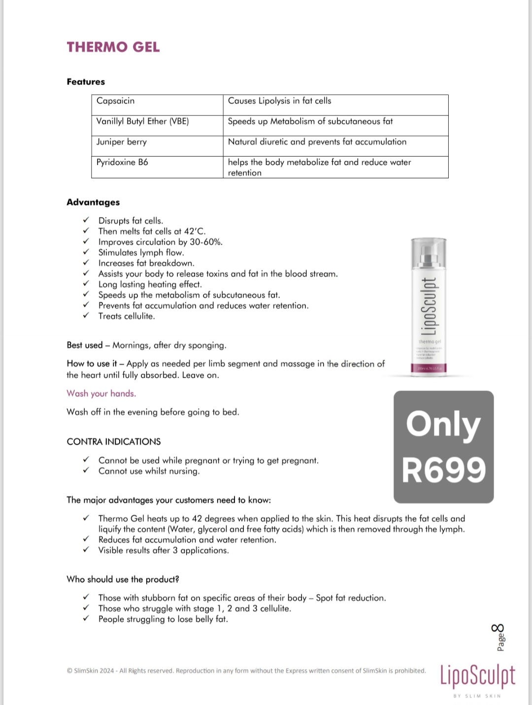Achieve smoother, firmer skin and tackle stubborn fat with LipoSculpt Thermo Gel, the ultimate external solution for reducing belly fat and minimizing cellulite. Powered by the fat-burning heat of Capsaicin and the detoxifying benefits of Juniper Berry, this advanced formula heats up to 42°C to visibly sculpt your body and improve skin texture.